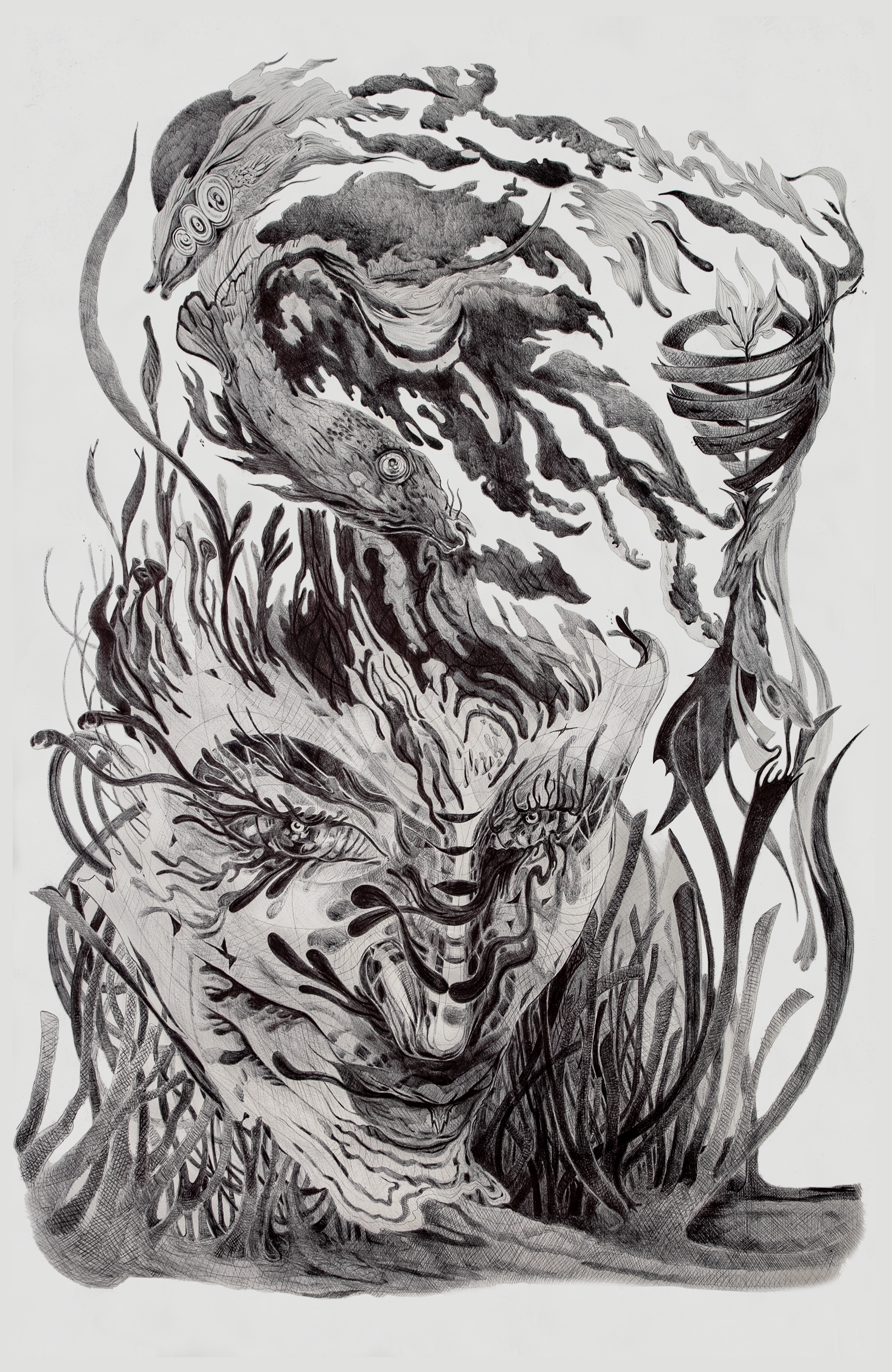 My experience making art tends to feel like going to the bottom of the ocean to explore a shipwreck. What I find is often unusual, strange, or unexpected. I take visual cues from fairy tales, Greek myths and music. All of the natural shapes in each piece are referenced from my own photo library and sketches that I've collected over the years. These elements culminate in a melange of past and present ideas that have been floating in my subconscious. I use art to explore themes that are typically too dark or painful to confront on a day-to-day basis such as self-destruction, rage, body horror, obsession, alienation, death and ecstasy. Through my work I hope to redefine the expectation of 'feminine' art.